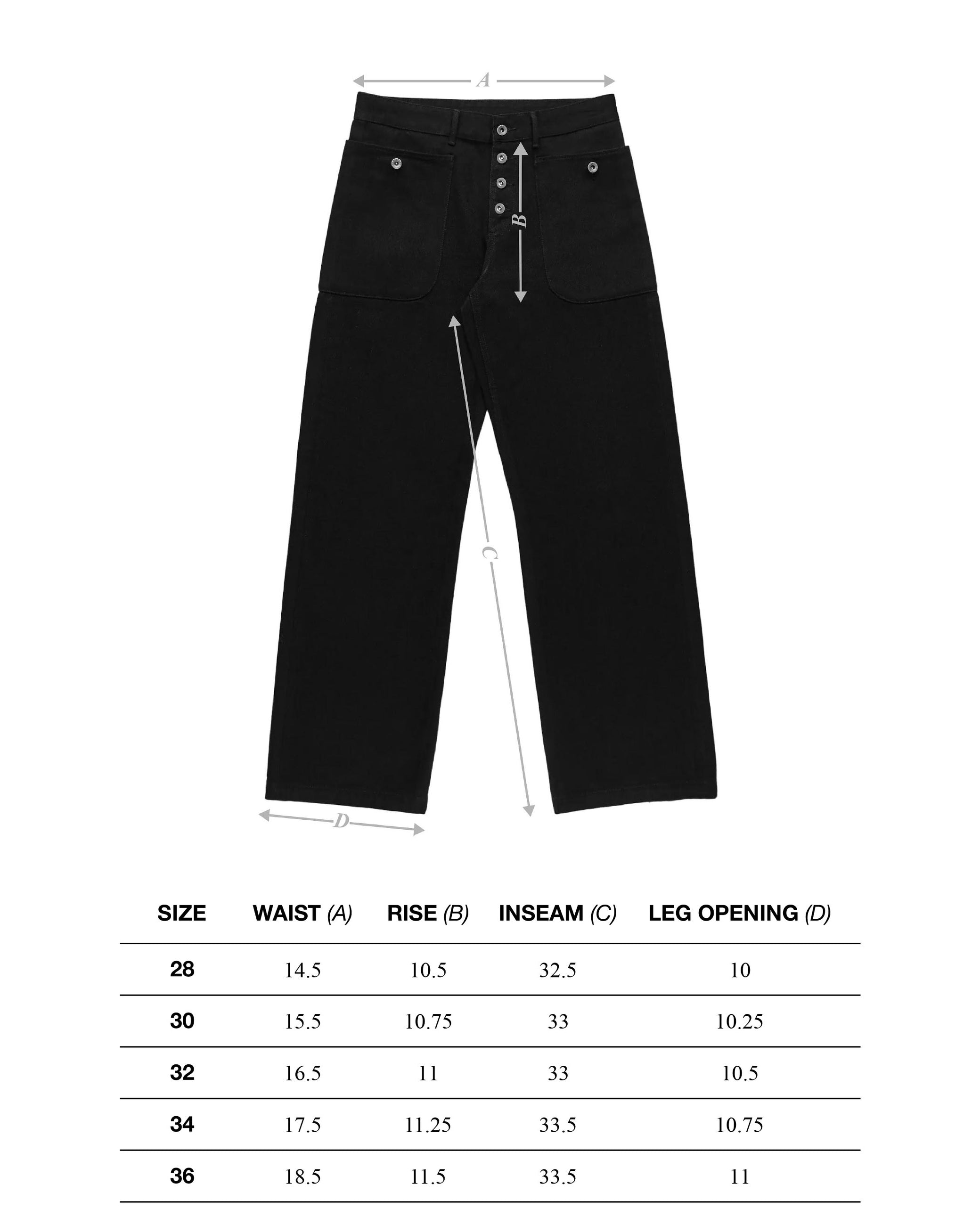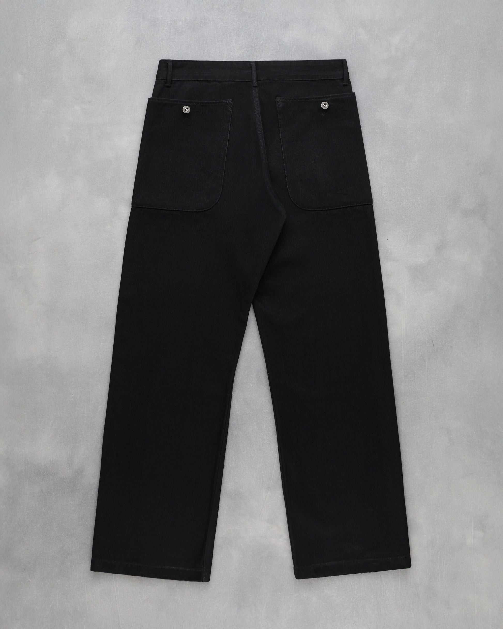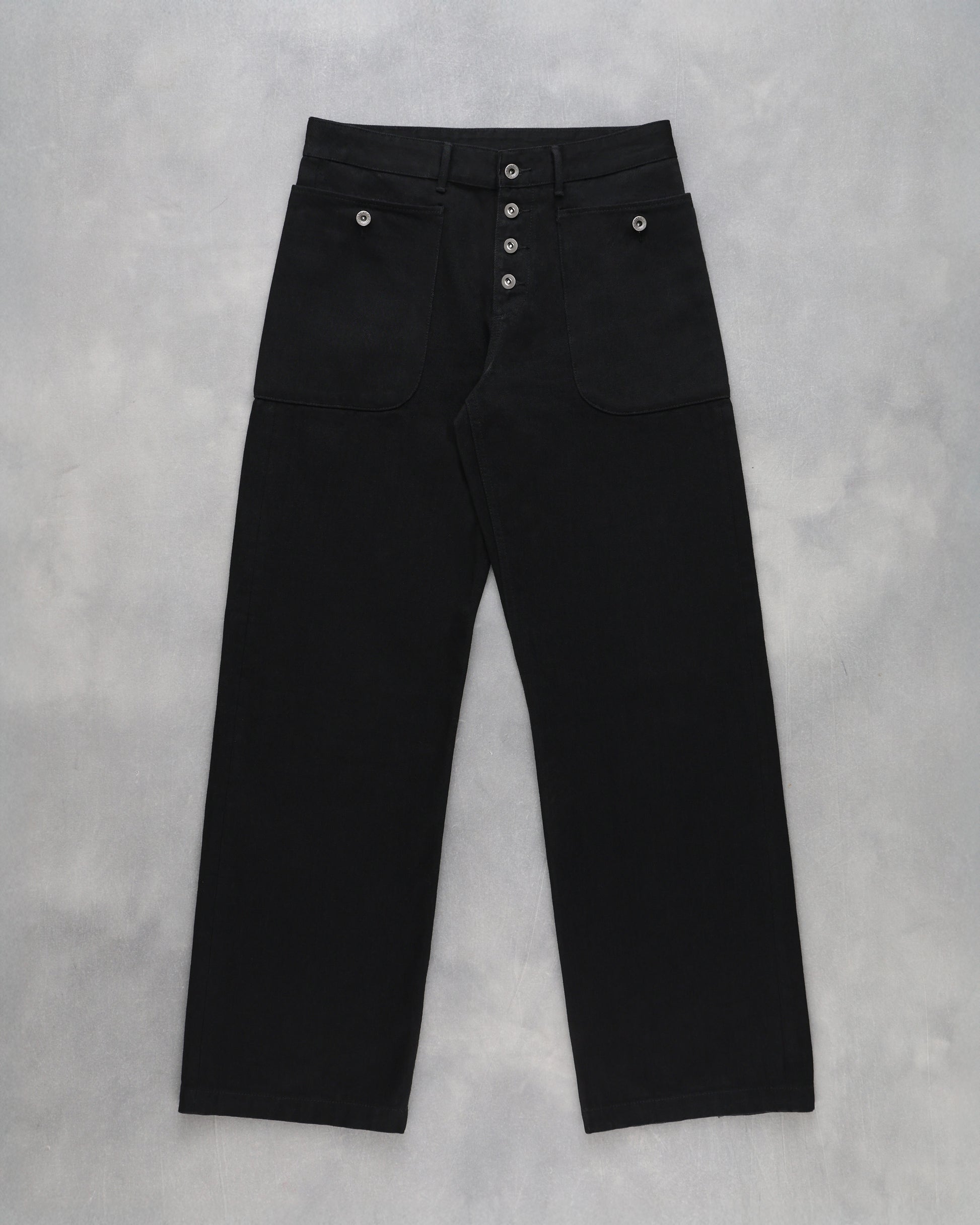 Inspired by classic ranch trousers and vintage overalls, the Rancher Pant features a wide, straight-leg silhouette with overall-inspired wraparound utility pockets. Constructed from heavyweight black selvedge denim with clean, rugged workwear detailing throughout.